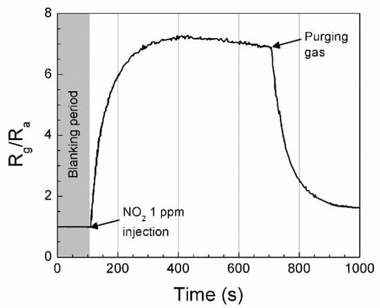 Response curve of the IN (In2O3) sensor for real-time motoring of NO2. The gas sensing process is composed of three steps, i.e., blanking period for 100 s, exposure to target gas for 600 s, and finally regeneration by dry air purging.