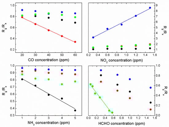 Calibration of the SN (SnO2 with 1 wt % Pd), IN, WO (WO3 with 1 wt % Ru), and SZ (SnO2-ZnO with 1 wt % Pd) sensors for monitoring CO, NO2, NH3, and HCHO. Note that black, red, blue, and green solid circles represent WO, SN, IN, and SZ, respectively.
