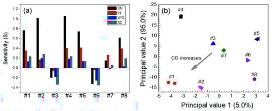 (a) Responses of the sensors and (b) PCA-based dual-gas sensor monitoring for the CO-NH3 system. Note that #1–#8 represent 30 ppm CO + 0 ppm NH3, 60 ppm CO + 0 ppm NH3, 0 ppm CO + 5 ppm NH3, 30 ppm CO + 5 ppm NH3, 60 ppm CO + 5 ppm NH3, 0 ppm CO + 10 ppm NH3, 30 ppm CO + 10 ppm NH3, and 60 ppm CO + 10 ppm NH3, respectively.