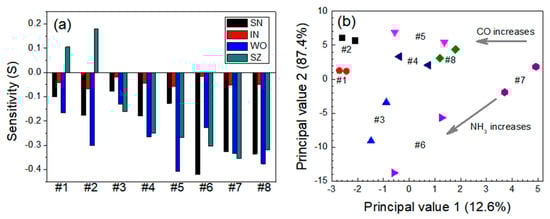 For the CO-NH3 system, as shown in Figure 7a, the responses to CO were stronger than those to NH3 for all sensors. Because both CO and NH3 are reducing gases having one or more than one lone pair of electrons, the sensitivity S for the mixed gas system was higher than that for each individual gas. The SN and SZ sensors were more sensitive to CO than to NH3 within the following test ranges: S = −0.179 (at CO = 30 ppm) and –0.420 (at CO = 60 ppm) for SN and S = −0.100 (at NH3 = 5 ppm) and −0.176 (at NH3 = 10 ppm) for SZ. The responses of the IN sensor to both gases were poor, and the sensor exhibited no selectivity. The WO and SZ sensors were sensitive to both gases, and the sensitivity to their mixture was enhanced. The sensitivity of the SN sensor was −0.420 for 60 ppm CO gas, but the sensitivity was slightly lower (S = −0.327) for a mixture containing 60 ppm CO and 5 ppm NH3. The sensitivity decreased further as the NH3 concentration in the mixture increased. In the corresponding PCA plot, the data points moved toward the upper-left side as the CO concentration increased, whereas they moved toward the lower-left side as the NH3 concentration increased (Figure 7b). The data points for the same group were diagonally dispersed, possibly owing to the higher sensitivity of the four individual sensors to the CO gas than to the other gases.