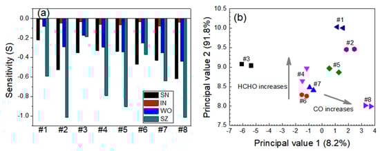 For the CO-HCHO system, the responses of the SN and WO sensors were almost identical for both gas species. The SZ sensor was more sensitive to HCHO than to CO. The IN sensor exhibited no responses to either gas species. The sensitivities of the four individual sensors are presented in Figure 8a. The response characteristics of the SN, WO, and SZ sensors in the CO-HCHO system exhibited almost the same pattern observed for the CO-NH3 system, except that the gas sensitivities were higher. The sensitivity of the SN sensor to 60 ppm CO gas was −0.470. The sensitivity was lower (S = −0.429) for a mixture containing 60 ppm CO and 2.5 ppm HCHO. The eight data groups shown in the PCA plots were clearly differentiated (Figure 8b). The data points moved upward as the HCHO concentration increased and toward the lower-right side as the CO concentration increased.