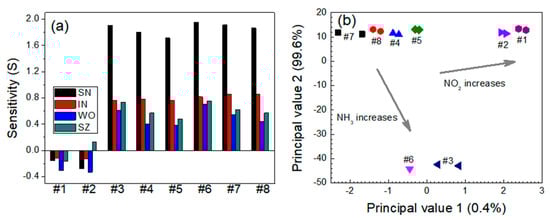 (a) Responses of the sensors and (b) PCA-based dual-gas sensor monitoring for the NO2-NH3 system. Note that #1–#8 represent 0.3 ppm NO2 + 0 ppm NH3, 0.6 ppm NO2 + 0 ppm NH3, 0 ppm NO2 + 5 ppm NH3, 0.3 ppm NO2 + 5 ppm NH3, 0.6 ppm NO2 + 5 ppm NH3, 0 ppm NO2 + 10 ppm NH3, 0.3 ppm NO2 + 10 ppm NH3, and 0.6 ppm NO2 + 10 ppm NH3, respectively.