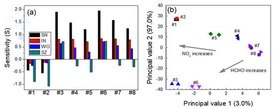(a) Responses of the sensors and (b) PCA-based dual-gas sensor monitoring for the NO2-HCHO system. Note that #1–#8 represent 0.3 ppm NO2 + 0 ppm HCHO, 0.6 ppm NO2 + 0 ppm HCHO, 0 ppm NO2 + 2.5 ppm HCHO, 0.3 ppm NO2 + 2.5 ppm HCHO, 0.6 ppm NO2 + 2.5 ppm HCHO, 0 ppm NO2 + 5 ppm HCHO, 0.3 ppm NO2 + 5 ppm HCHO, and 0.6 ppm NO2 + 5 ppm HCHO, respectively.