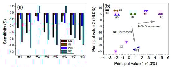 (a) Responses of the sensors and (b) PCA-based dual-gas sensor monitoring for the NH3-HCHO system. Note that #1–#8 represent 5 ppm NH3 + 0 ppm HCHO, 10 ppm NH3 + 0 ppm HCHO, 0 ppm NH3 + 2.5 ppm HCHO, 5 ppm NH3 + 2.5 ppm HCHO, 10 ppm NH3 + 2.5 ppm HCHO, 0 ppm NH3 + 5 ppm HCHO, 5 ppm NH3 + 5 ppm HCHO, and 10 ppm NH3 + 5 ppm HCHO, respectively.