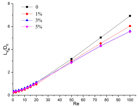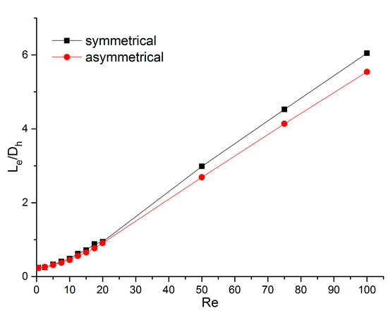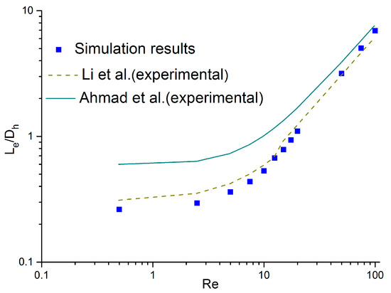 Figure 6 shows the variation of the dimensionless entrance region length ( L e / D h ) with the Reynolds number (Re) using the simulation results obtained in this study. The simulation results are shown by scatter plots, while Equations (9) and (10) are shown as solid lines in the graph at the same time.
