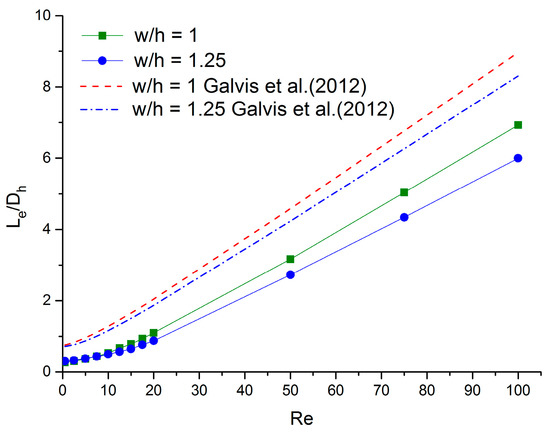 The comparison between simulation results and the previous simulation study [24] is shown in Figure 3. There are two groups of channels with aspect ratios of 1 and 1.25. The entrance length estimated by study [24] is longer than in this work. This discrepancy may be a result of the different inlet conditions. The present study set a reservoir before the inlet of the microchannels to simulate real inlet conditions for the flow in the microchannels. Galvis et al. [24] gave a uniform velocity at the entrance. The uniform velocity may need a longer distance to become a fully developed velocity profile. Hence, the entrance lengths are longer than in this work.