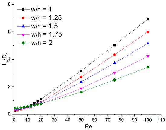 The variations of the dimensionless entrance region length ( L e / D h ) with the Reynolds number (Re) in all five microchannels are shown in Figure 4. All these plots share a common trend: the correlation is nonlinear for Re 15 but it becomes linear as the Reynolds number increases. This trend is consistent with the experimental conclusion in Hao et al.’s research [22]. In addition, it also indicates that microchannel aspect ratios have no significant effect on dimensionless entrance region lengths for Re 15, but for Re ≥ 15, the dimensionless entrance length decreases as the channel aspect ratio grows for a given Reynolds number. Additionally, the gap between different channels increases with increasing Reynolds number. The channels with lower aspect ratio need a longer entrance region for higher Reynolds numbers; this may contribute to the fact that the influence of the wall viscous force is stronger in microchannels with lower aspect ratios. Since a lower aspect ratio means the walls are closer to each other when the hydraulic diameters are similar. It should be noted that the calculated difference between two parts of the correlation for 12.5 < R e < 15 was less than 8.6%. Therefore, the Reynolds number range from 12.5 to 15 is considered as a transition region for the entrance length, and both nonlinear and linear correlations could be applied.