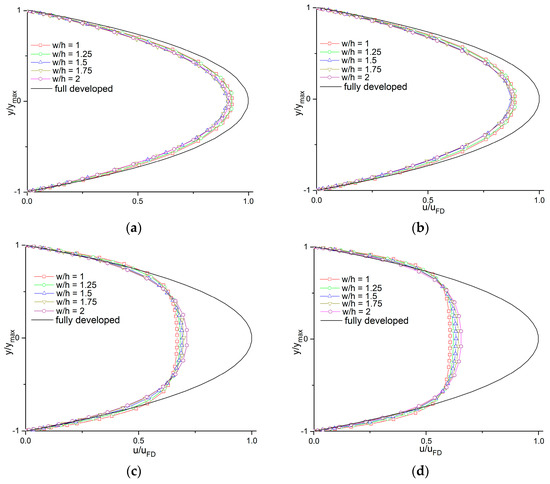 The velocity profiles at the entrance (x = 0) of the five channels with different aspect ratios (w/h) are shown in Figure 4, and they are compared with the theoretical fully developed velocity profile, which is shown as a black solid line. In the plots, the vertical distances (y) are normalized with the half-height of the channel ( y m a x ), while the axial velocities (u) are normalized with the theoretical maximum axial velocity ( u F D ), which is considered as the fully developed velocity at the centerline.