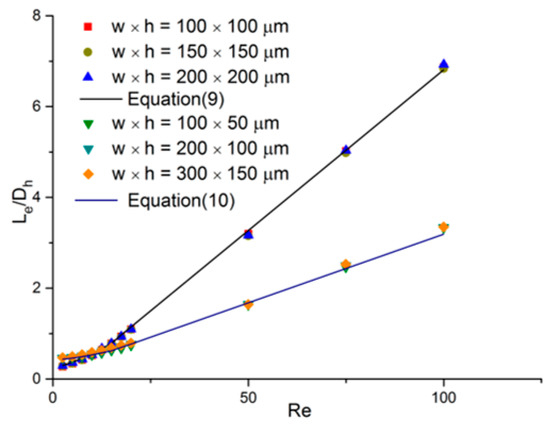 From the above research, the microchannel entrance length correlations for w / h = 1 and w / h = 2 microchannel are as in Equations (9) and (10), respectively:
