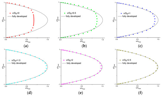 Figure 7. Velocity profiles at different locations along the axial length of the microchannel with D h = 100   μ m (Re = 50). (a) x / D h = 0 ; (b) x / D h = 0.5 ; (c) x / D h = 1 ; (d) x / D h = 1.5 ; (e) x / D h = 2 ; (f) x / D h = 2.5 .