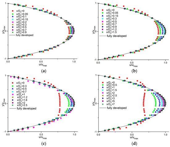 Figure 8. Developing velocity profiles along the axial length at different Reynolds numbers; D h = 200   μ m . (a) Re = 0.5; (b) Re = 5; (c) Re = 20; (d) Re = 50.