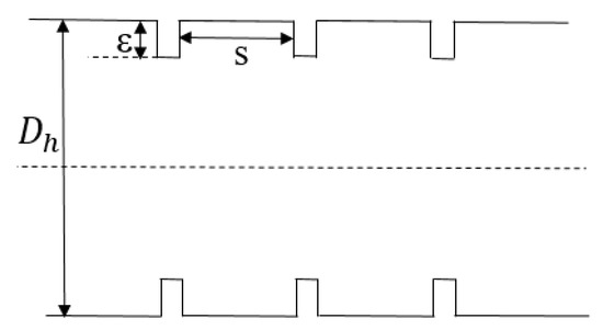 Rough elements were simulated by fins distributed along the length of the channel, and their local distribution is shown in Figure 9. The hydraulic diameter is described as D h , the height of the roughness element as ε, and the distance between two adjacent rough elements as s.