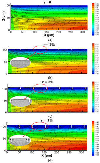 Figure 10. Velocity nephograms and streamlines of the microchannels with relative roughnesses r of 0%, 1%, 3%, and 5%. (a) r = 0; (b) r = 1%; (c) r = 3%; (d) r = 5%.