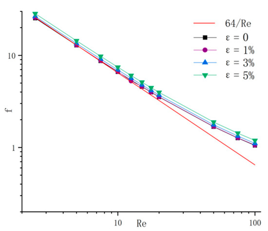 According to the research [27], there is no significant effect on laminar flow in channels when the relative roughness of the channel wall is less than 5%. This conclusion has been widely accepted by scholars. The friction factor of the microchannel is given by f = 2 Δ p D h ρ L u m 2 , where L and Δ p are the length of the microchannel and pressure drop, respectively. Moddy’s chart indicates that the friction factor should satisfy f = 64 / R e in conventional-scale channels when the relative roughness is less than 5%.