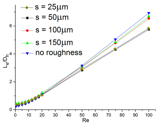 The results obtained from the simulations are shown in Figure 13. For a given Reynolds number, the model without roughness had the longest entrance length and the channel with a distance of 50 µm had the shortest one. For Re = 5, the dimensionless entrance region length was 0.39 when s = 50 µm, and it was 0.42 when s = 100, and the relative discrepancy was 8.2%. However, when Re = 100, this discrepancy increased to 17.9%, with the values of dimensionless entrance length 5.55 and 6.54, respectively. Therefore, the distance of two adjacent rough elements had a significant effect the entrance effect. The following can be seen from the graphs: (1) Compared with the smooth channels, the rough ones had the shorter entrance lengths; (2) the entrance length decreased with decreasing distance and this became more notable with higher Reynolds numbers.