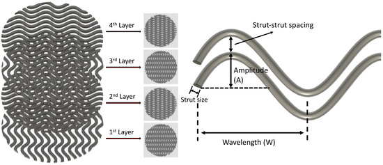 Wavy scaffold design containing 4 layers (left) and schematic showing the strut design for wavy scaffolds (right).