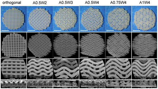 PCL scaffolds with six distinct designs, including one linear design (orthogonal) and five wavy designs in the form of a sinusoidal wave with varying amplitude (A) and wavelength (W) (A0.5W2, A0.5W3, A0.5W4, A0.75W4, and A1W4, where the numbers following A and W denote the actual values of A and W in mm) were printed (Table 1). Figure 2 shows the pictures, micro-CT images, and SEM images of the scaffolds. SEM images were used to measure the printed strut width and spacing between struts for each design, and the results are summarized in Table 1. Briefly, when all the designs were considered, the average strut width was within the range of 460 ± 58 to 533 ± 9 μm, and the spacing between struts (strut-to-strut distance) was within the range of 277 ± 59 to 395 ± 6 μm.
