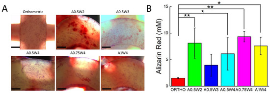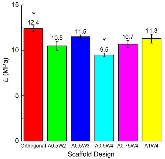 Young’s modulus (E) values of the scaffolds for each scaffold design. * p < 0.005 for orthogonal vs. A05W2, A0.5W4, and A1W4; and for A0.5W4 vs. all sample groups.