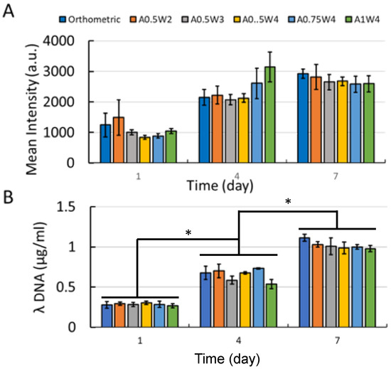 (A) AlamarBlue assay results; (B) PicoGreen assay results. (* p < 0.005).