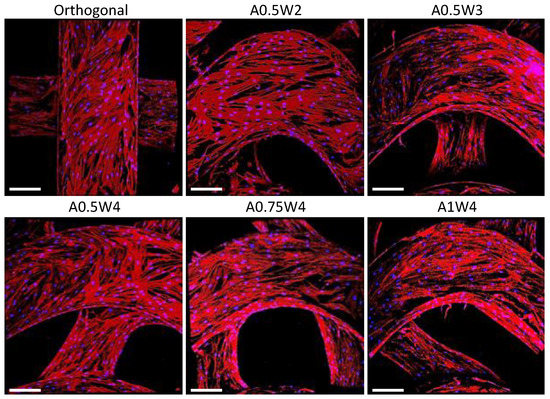 First, the growth study was conducted to determine the attachment and proliferation of the hMSCs cultured on our scaffolds. The metabolic activities of the cells were not significantly different from each other at each culture day, but increased significantly with culture day, reaching a maximum at Day 7 (Figure 4A). The same trend was observed when the DNA was quantified (Figure 4B). Note that this trend was not true for the A1W4 and A0.75W4 sample groups, for which the metabolic activity reached a maximum at Day 4 and did not change significantly at Day 7. Yet, the DNA count did not show this unexpected trend for these two sample groups, which represented the cell proliferation more accurately. F-actin staining at Day 7 confirmed that cells attached onto the struts and formed confluent layers at Day 7, taking the shape of the struts. Cells on wavy scaffolds were highly elongated, especially on the curved edges with well-defined F-actin filaments aligned with the scaffold curvature as compared to much bulkier cells on orthogonal scaffolds (Figure 5). In addition, stem cells on wavy scaffolds showed mature vinculin (focal adhesion marker) patches as compared to diffused vinculin staining of cells on orthogonal scaffolds at Day 7 (Figure 8). Focal adhesion is a vital step in osteogenesis [85] in which vinculin directs the interaction between talin and actin to direct the focal adhesion process [86]. We investigated if these significant changes in stem cell morphology, F-actin expression, and focal adhesion on wavy scaffolds as compare to orthogonal scaffolds correlated with stem cell osteogenesis on wavy scaffolds. It was also noted that the curvature had a direct effect on cell proliferation, and studies have shown that curvature induced contractility enhances proliferation and cell growth [87,88,89]. In our study, we did not observe a significant difference in proliferation between sample groups. This was not contradictory to the literature as each of our wavy scaffolds displayed both concave and convex curvature, and the overall cellular behavior was collective rather than distinct for each type of curvature.