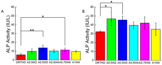 Alkaline Phosphatase (ALP) activity assay results for: (A) Day 14 and (B) Day 21 (* p < 0.15, ** p < 0.05, for n = 3).