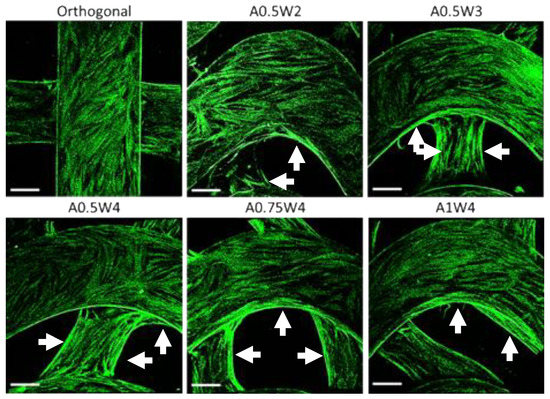The hMSC growth studies were performed by culturing cells in growth media for up to seven days. The results for AlamarBlue assay and PicoGreen assay are shown in Figure 4. The AlamarBlue assay results showed that the measured mean intensities increased from Day 1 to Day 7, which indicated an increased metabolic activity with culture time. There was an exception for A1W4, which showed a drop from Day 4 to Day 7. At Day 7, no significant difference was observed between the test groups. For the PicoGreen assay, a similar trend was observed as the mean value of λ-DNA ascended from Day 1 to Day 7. At Day 7, there was no difference between the test groups. The multiphoton confocal images of the stem cells (F-actin in green and cell nuclei in blue) cultured on the 3D printed scaffolds for seven days are given in Figure 5. F-actin filaments were aligned with the printed struts that formed the scaffolds, and this alignment was more pronounced in the curved regions in wavy scaffolds.