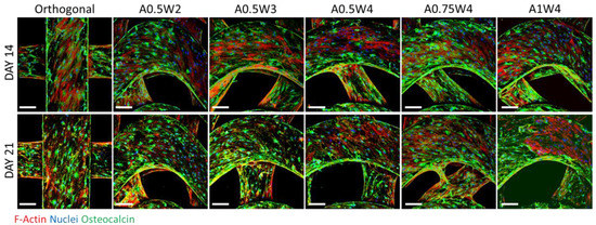 Osteogenic differentiation of hMSCs cultured on the 3D printed scaffolds was studied for up to 21 days. Figure 6 shows the results from alizarin red (AR) staining and assay. The scaffolds with wavy designs showed more staining (Figure 6A) and higher values of mean calcium deposition (Figure 6B). The value of the mean calcium deposition in wavy groups was in the range of 2.5 to six times higher than that of the orthogonal group. Specifically, the average calcium deposition was equal to 9.33 ± 0.98 mM for A0.75W4, 8.14 ± 2.86 mM for A0.5W2, 7.60 ± 1.65 mM for A1W4, 6.12 ± 3.07 mM for A0.5W4, 3.96 ± 2.06 mM for A0.5W3, and 1.53 ± 0.10 mM for orthogonal scaffolds, in descending order. ALP activity assay results, at Culture Days 14 and 21, are given in Figure 7. Our results showed an increase in ALP activity for all sample groups from Day 14 to Day 21, and the ALP activity of the wavy scaffolds was higher than that of the orthogonal group at both Day 14 and Day 21 (Figure 7). At Day 14, A0.5W3 (13.16 ± 3.17 a.u.) was significantly higher than the orthogonal group (5.96 ± 1.58 a.u.). At Day 21, A0.5W2 (46.83 ± 7.90 a.u.) and A0.5W3 (45.51 ± 4.20 a.u.) were much higher than that of the orthogonal group (32.31 ± 0.89 a.u.). Representative fluorescent images showing vinculin staining at Day 7 are shown in Figure 8. We observed more pronounced vinculin fibers that were aligned with the wavy struts for wavy scaffolds as compared to diffused and randomly oriented vinculin for the orthogonal scaffold. Figure 9 shows the representative confocal images of the hMSCs cultured on 3D printed scaffolds, in which cells were stained for osteocalcin (OC, green), F-actin (red), and nuclei (blue) at Culture Day 14 and 21. Osteocalcin staining was more pronounced on curved struts as compared to linear struts.