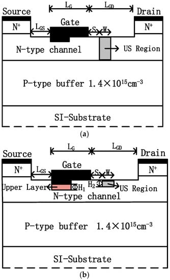 Schematic cross-section of the DRUS-MESFET and the LDUS-MESFET are shown in Figure 1a,b, respectively. They both have a semi-insulating substrate, a p-type buffer layer, an n-type channel layer, and two highly doped n-type cap layers. The semi-insulating substrate is modeled as a compensation-doped (vanadium) semiconductor with a high concentration of deep level impurities []. Among them, the role of the p buffer layer is to reduce the influence of substrate defects on the active layer and improve noise performance and device gain []. Both of these structures have upper and lower gates, which control a thinner and a thicker part of the channel, respectively. The difference between the two structures is that the LDUS-MESFET has a layered doping under the lower gate, wherein the upper layer region has a doping thickness of H1 = 0.05 μm and a concentration of 6 × 1017 cm−3 (to have a meaningful comparison, the lower layer region doping concentration of the LDUS-MESFET based on the DRUS-MESFET is also set at 3 × 1017 cm−3), and the thickness of the undoped space region (US) is optimized for high efficiency. The optimization result is H2 = 0.05 μm. The other parameters of the two structures are shown in Table 1.