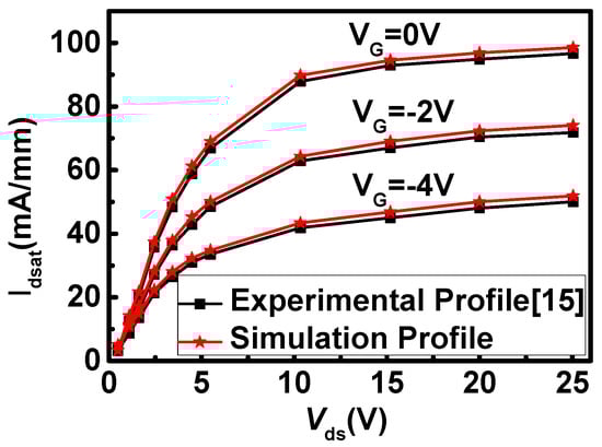 Two dimensional numerical device characteristics are realized with ISE-TCAD. The simulator is calibrated with experimental data in the micrometer regime [], and the agreement between experimental data and simulation results is obtained as shown in Figure 2. In order to accurately simulate the electrical characteristics of the 4H-SiC MESFET device structure, the main physical models used are mobility (Enormal, Doping Dep, High Field saturation (GradQuasiFermi)), recombination (Auger, SRH (DopingDep)), incomplete ionization, effective intrinsic density (Band Gap Narrowing (OldSlotboom)). The DC and AC parameters of the device are obtained by ISE-TCAD simulation, and these parameters are input into the ADS software to simulate the power added efficiency of the device. In the ADS simulation, the model used is EE-FET3, an empirical analytical nonlinear model used to fit the electrical properties of MESFETs. And the working bias conditions were set as follows: Vgs was −3.5 V, Vds was 28 V, RF was 1.2 GHz and input power Pavs was 24 dBm.