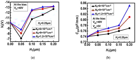 The effect of the thickness and doping concentration of the upper layer region on DC and AC parameters are shown in Figure 3. It can be seen from the Figure 3a that as the doping concentration increases, the absolute value of the threshold voltage increases significantly. When H1 is less than 0.05 μm, the absolute value of Threshold voltage (Vt) is gradually decreasing with the increase of H1. Because there is a longitudinal concentration gradient in the channel. The concentration gradient produces a longitudinal electric field that weakens the pinch-off voltage, which results in a decrease in the absolute value of the threshold voltage. When H1 is greater than 0.05 μm, the absolute value of Vt is increasing with the increase of H1. Because as the doping thickness increases, the number of electrons in the channel increases, causing the threshold voltage to drift negatively. At H1 = 0.05 μm, the absolute value of the threshold voltage has a minimum value. In Figure 3b. As the doping concentration increases, Gate-source capacitance (Cgs) also increases. At the same time, Cgs shows an upward trend with the increase of H1. In Figure 3c,d, as the doping concentration increases, the saturation current (Idsat) increases significantly, and the breakdown voltage decreases. When H1 rises from 0 to 0.05 μm, the saturation current increases rapidly. When H1 increases from 0.05 μm, the rising trend of saturation current becomes slow.