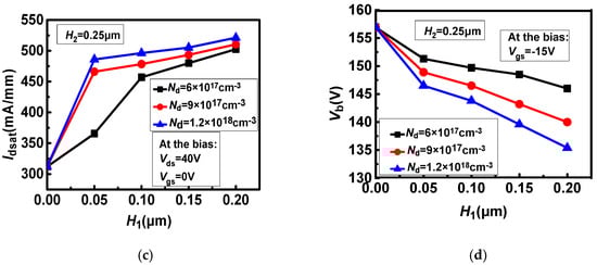 The effect of H1 and Nd on the device parameters: (a) Vt–Nd and H1, (b) Cgs–Nd and H1, (c) Idsat–Nd and H1, (d) Vb–Nd and H1.