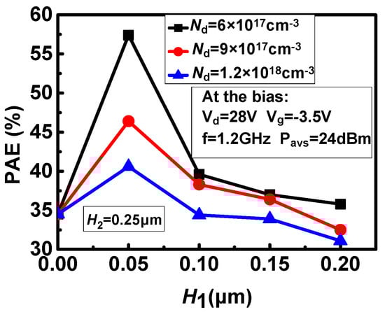 The influences of the doping concentration and thickness of upper layer region on PAE is shown in Figure 4. It can be seen from the figure that as the doping concentration of the upper layer region increases, the PAE significantly decreases. When the thickness of the upper layer region is less than 0.05 μm, the PAE increases with the increase of H1. When H1 is greater than 0.05 μm, the PAE decreases with the increase of H1. When the thickness of the upper layer region is 0.05 μm, the PAE reaches a maximum value.