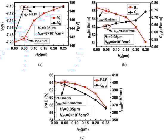 Based on the thickness and doping concentration of the upper layer region determined above, the thickness of the undoped region is optimized to obtain better power added efficiency and DC AC parameters. The effect of the thickness of the undoped region on the DC, AC parameters and PAE of the device is shown in Figure 5. In Figure 5a. We can see that as H2 increases, the absolute value of the threshold voltage gradually decreases. At the same time, when H2 is less than 0.05 μm, the breakdown voltage increases as H2 increases, when H2 is greater than 0.05 μm, the breakdown voltage shows a basically constant trend with the increase of H2. In Figure 5b. As H2 increases, the transconductance (gm) shows a decreasing trend. When H2 is less than 0.15 μm, the transconductance decline trend is more gradual. When H2 is greater than 0.15 μm, the transconductance decreases sharply as H2 increases. When H2 increases, Cgs shows an upward trend. In Figure 5c. As H2 increases, the saturation current shows a linear decline. When H2 is less than 0.05 μm, the PAE increases as H2 increases, and when H2 is greater than 0.05 μm, the PAE decreases as H2 increases. The PAE reaches the maximum at H2 = 0.05 μm.