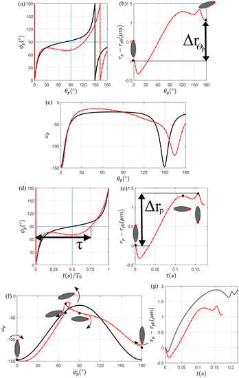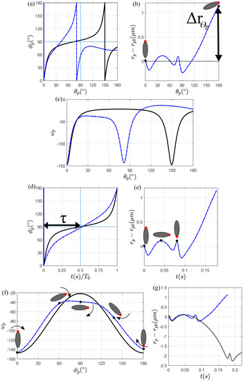 The observation of an elliptical particle’s dynamics under a magnetic field applied at can thus be explained. In the absence of a magnetic field, the particle rotates due to the hydrodynamic torque. The particle, however, has a net zero migration after one periodic rotation, but migrates towards the channel wall at , as shown in Appendix C. In Figure 2a, we see that the applied magnetic field strength and direction rotates the particle backwards towards due to the direction and magnitude of the shear rate at the particle position inside the channel and its distance from the wall. In the range , the particle exposed to A/m rotates toward because the magnetic torque is stronger than the hydrodynamic torque (i.e., the particle is in a strong field regime) and the orientation of the particle at that range approaches towards its stable steady angle [25,26,27,30]. The rotation of the particle over time is thus caused by the hydrodynamic and magnetic angular velocities, shown in Figure 2c,f. The magnetic angular velocity, , is in the opposite direction of the hydrodynamic angular velocity, , in the first half of the particle orientation and is in the same direction for . As a result, the particle will spend a longer time in the first half of its rotation compared to its second half (i.e., the particle rotation becomes more asymmetric). Thus, at a certain position , the particle orientation allows the particle to radially migrate away from the wall faster due to the rotational dynamics affected by the magnetic field and the wall lift force caused by the hydrodynamic interaction. Otherwise, the particle continues its periodic rotation in other parts of the channel since the magnetic field is either considered weak compared to the hydrodynamic angular velocity or both angular velocities are in the same direction.