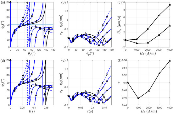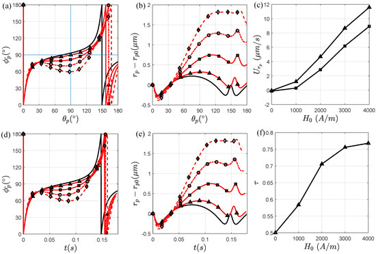 Effect of the magnetic field strength when it is applied at . The particle () is affected by the magnetic field when its center of mass is approximately at in (a,d) when its rotation is with respect to and time, respectively, for, A/m (solid black line), A/m (triangle symbol), A/m (square symbol), A/m (circular symbol), and A/m (diamond symbol). The radial particle-wall distance change of the particle with respect to (b) , and (e) time. (c) The radial velocities of the particle (triangle symbol) and (square symbol) as functions of . (f) The dimensionless parameter as a function of . We see that as increases, the net migration of the particle increases.