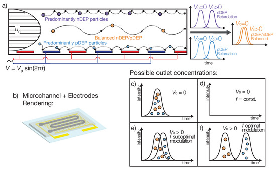 Separating microparticles according to specific properties such as size, material, and shape is a research area of great interest for instance in cell or biomolecule manipulation [1,2,3,4,5] and waste recovery [6,7]. To separate microparticles, field-flow fractionation [8], gel electrophoresis [9], and size-exclusion chromatography [10] are state-of-the-art approaches. A major drawback of these approaches is their low throughput or low selectivity for particle mixtures with similar separation properties (e.g., shape, density) below a particle size of 10 [11,12,13]. Dielectrophoresis (DEP), which is referred to as the movement of polarizable particles in an inhomogeneous electric field, offers an alternative tool to address a wide range of particles and at the same time is able to achieve relevant throughputs [14,15]. The dielectrophoretic force not only depends on one specific property of a particle, but on a variety of particle properties, such as size [16,17], permittivity, and electrical conductivity [1], allowing for multi-dimensional particle fractionation. Apart from established DEP concepts such as field-flow fractionation [17,18], filtration [19], selective trapping (e.g., insulator-based dielectrophoresis) [20], dielectrophoretic particle chromatography (DPC) is a promising concept to achieve high throughput separation of particles. Since DPC was introduced by Washizu et al. [5], different approaches were done using selective trapping of particles [21,22], packed bed columns [23], or stepwise change of the frequency [24]. DEP chromatography proved to be very successful in isolating circulating breast tumor cells (CTCs) from blood [25] at a very low concentration. Such studies later led to the development of a clinical high throughput device to separate CTCs from blood samples [26,27]. Aldaeus et al. [28] developed an analytical model for a DPC device that was based on multiple trap and release cycles for fractionation. A related technique to manipulate micrometer sized particles is using traveling wave dielectrophoretic separators [29,30]. In these microfluidic devices, a 90 phase angle is present between adjacent electrodes, which changes the dielectrophoretic movement a particle experiences [31,32]. Such traveling wave systems offer versatile particle separation techniques, but are usually complex to fabricate and operate [30,33]. The other presented dielectrophoretic chromatography techniques have in common that they depend on strongly diverging polarizabilities (e.g., one type of particle showing positive dielectrophoresis, whereas the other particles show negative dielectrophoresis or exhibit no dielectrophoretic movement). This requirement limits the applicability when addressing particle mixtures with less pronounced differences in polarizability. Addressing binary (or more) mixtures in which there is heterogeneity in the two (or more) classes is even more complex, especially when the cross-over frequencies of the classes are so close that the heterogeneity causes an overlap (an example is the separation of cells according to only small differences in their expression).