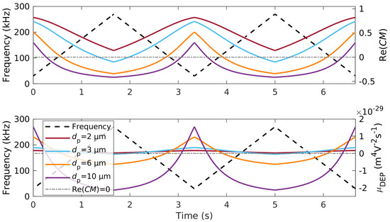 Real part of the Clausius–Mossotti factor Re(CM) (top) and dielectrophoretic mobility (bottom) of four different polystyrene particles over time for two full cycles (right ordinate axis of diagram). The modulated frequency is shown as well (left ordinate axis). Particles suspended in DI water with −1, , and , calculated with Equations (3) and (4).