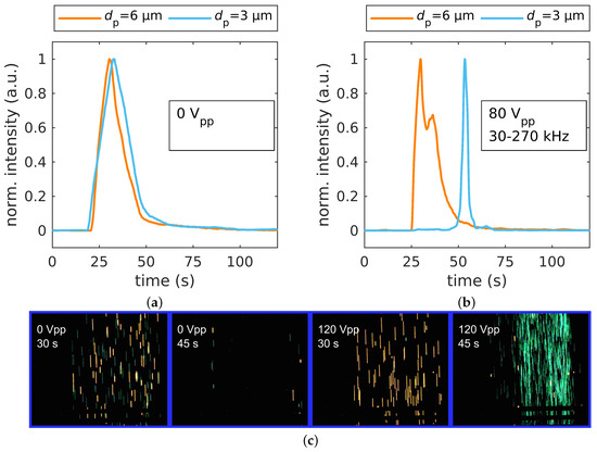 (a) Separation of 3 and 6 polystyrene particles: fluorescence intensity over time for no applied voltage, (), and (b) when applying 80 pp at 30 –270 with a modulation frequency of 300 , (). (c) Single frames of different times of 3 (yellow-green) and 6 (orange/red) fluorescent polystyrene particles (brightness and contrast are adjusted for better visibility).