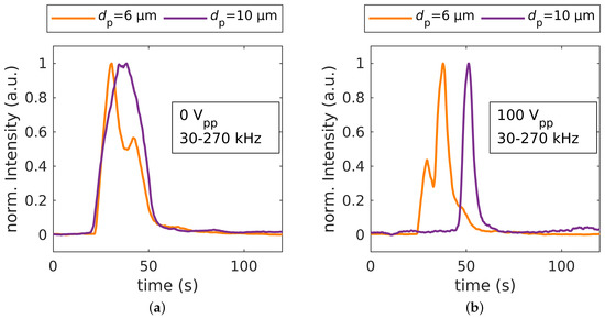 (a) Separation of 6 and 10 particles: fluorescence intensity over time of without applied voltage, (), and (b) with application of 80 pp at 30 –270 with a modulation frequency of 300 , ().