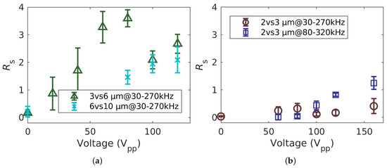 Resolution of DPC over applied voltage for different particle suspensions and frequencies. (a) 3 vs. 6 and 6 vs. 10 PS particles at 30 to 270 . (b) 2 vs. 3 PS particles at 30 to 270 and 80 to 320 .