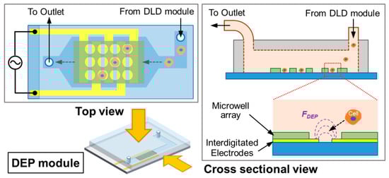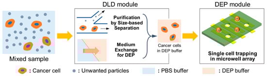 Recently, microfluidic approaches employing gravitational force, hydrodynamic force, or dielectrophoresis (DEP) have been developed to perform assays of suspended cells, at the single-cell level. In particular, various studies regarding the manipulation of mammalian cells have been performed using DEP. These studies involve the isolation and separation [,,,,,], sorting [,,], and trapping [,,] of cells inside microfluidic devices. We also developed a microfluidic device employing a microwell array to trap single rare cells [,]. Although a microfluidic device that employed DEP for cell trapping has been successfully demonstrated, there are several issues in the practical application of the systems for the analyses of various samples. First, the sample should be purified by prior separation such that only the targeted cells are trapped, using DEP. Second, it is always necessary to exchange the existing medium (e.g., culture medium) with the specific buffer to induce strong DEP movements. Currently, these processes are performed manually as pre-processing steps, including centrifugation and liquid handling, separate from the main DEP process. Thus, it is clear that pre-processing of samples should be integrated with the main analysis step to ensure an efficient analysis of the suspended cell samples.