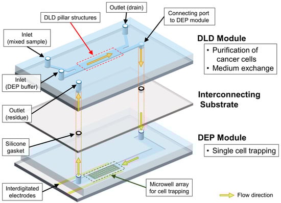 The interconnecting substrate was prepared using customized gaskets that were fabricated by screen printing a glass plate. Initially, holes were drilled in the glass plate, and these holes were used for connecting the DLD module on top, the glass plate in the middle, and the DEP module at the bottom. After the grooves for the gaskets were prepared at the top of the glass plate, the gaskets were then directly fabricated on the groove, using liquid-type silicone rubber (NOK Co., Tokyo, Japan). The thickness, inner diameter, and outer diameter of the printed gasket were 180 μm, 2 mm, and 4 mm, respectively. Finally, the surfaces of each layer were treated with oxygen plasma and bonded together, with the alignment of respective outlets and holes in the glass plate.