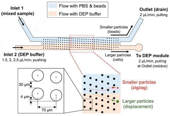In our study, we integrated the DLD module with the DEP module to achieve two purposes: the purification of target cells and buffer exchange. Here, buffer exchange means that the PBS constituent in a mixed sample is exchanged with the DEP buffer that was introduced from Inlet 2. In the DLD module, the flow including PBS is formed above the line connecting both branches because the laminar flow is generated as shown in Figure 3. Thus, the sample, except for the separated PC3 cells, finally flows into the outlet for drainage. In contrast, the DEP buffer from Inlet 2 flows below the PBS stream and proceeds into the DEP module with PC3 cells.