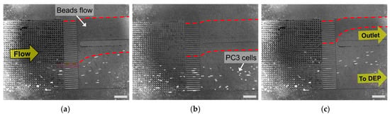 Figure 4 presents the microscope image near the outlet of the DLD module. PC3 cells, which has a different emission wavelength from microbeads, were confirmed by fluorescent microscopic images. The red dashed lines shows the trajectory and overall area of beads flow. It was evident that PC3 cells were purified from the mixed sample by the separation using DLD pillar structures. We observed that a few beads flowed into the connecting port to the DEP module, with a flow rate of 1.5 μL/min (Figure 4a). However, the beads flowing to the DEP module decreased gradually as the flow rate was increased to 2 and 2.5 μL/min. We calculated the separation efficiency of the PC3 cells by dividing the number of all separated PC3 cells with the number of total counted cells. Table 1 lists the results of the separation efficiencies with respect to three different flow rates. As shown in Table 1, it was quantitatively confirmed that the PC3 cells were successfully purified by the separation from the mixed sample in the overall flow rates. A separation efficiency exceeding 94% was achieved for all flow rates. It was also confirmed that the critical diameter, which was designed as 10.63 μm, corresponded well to the acquired separation results and efficiencies.