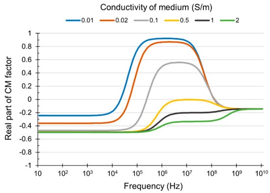 where , , , and are the permittivity, radius of the cell, frequency, and electric field strength, respectively. represents the real part of the polarization factor, also known as the real part of the Clausius–Mossotti (CM) factor. Here, indicates the complex permittivity, where is the conductivity; , and the subscripts cell and medium represent the cell and the suspending medium, respectively. An important characteristic of DEP is that two different DEP phenomena occur according to the value of the real part of the CM factor. One is positive DEP whereby cells are attracted toward the strong electric field, when the value of is greater than 0. The other is the negative DEP whereby cells are repelled away from the strong electric field when the value of is less than 0. These two different movements were used to manipulate particles, including cells and microbeads [,,,,].