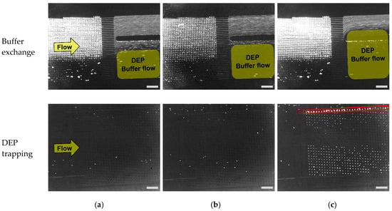 In the previous section, we confirmed that the PC3 cells were purified from the microbeads by the DLD module. Here, we confirmed the buffer exchange at the outlet of the DLD module as well as the continuous cell trapping in the DEP module. All flows with beads and cells were observed or counted visually using fluorescence microscopy. Figure 7 shows the microscopic images of buffer exchanges and the cell trapping using DEP. To observe the buffer exchanges, we used different fluorescent beads having similar ranges of excitation/emission wavelengths of stained cells in order to visualize all the beads and cells simultaneously. As a result, the flow of beads or cells was confirmed as shown in Figure 7 (upper, Buffer exchange). It was observed that the flow with beads was clearly visualized by its flow shape due to the high concentration of beads (103–104 times bigger than that of cells). The yellow rectangles indicate the area where the DEP buffer flows, which shows that the flow of beads did not get into the DEP buffer stream.
