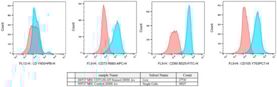 Human amniotic-derived mesenchymal stromal cells (hAMSCs) were isolated from the amniotic sack and cultured at the Danube University Krems. The study was approved by the Ethics Commission of the Medical University Vienna (EK791/2008, EK1192/2015), the University Hospital of Lower Austria (GS1-EK-4/312-2015), and the Danube University Krems (Nr.821/2009, 3 September 2015). The placenta was obtained from a healthy delivering woman per the Austrian Hospital Act (KAG 1982) after written informed consent was obtained. The amniotic membrane was isolated from the placenta and cut into 3 × 3 cm squares, and then the pieces were washed in physiological NaCl solution and digested with dispase (2.5 CU/mL, Becton Dickinson, Franklin Lakes, NJ, USA) for 9 min at 37 °C (Soncini et al. 2007). The slice was incubated in a mixture of collagenase A (1 mg/mL) and DNase I (0.01 mg/mL both from Roche, Basel, Switzerland) for 2 h at 37 °C. To separate the stem cells from the tissue, we centrifuged the mixture at 180 g for 5 min, and the supernatant was strained with a 100 µm cell-strainer. The amniotic cell suspension was centrifuged at 360 g for 10 min, and then they were proliferating in an adherent 2D cell culture in plastic cell culture flasks. The cell culture was maintained within an MSCGMTM (Lonza Group Ltd., Basel, Switzerland) supplemented with 100 U/mL penicillin, 100 µg/mL streptomycin, and 250 ng/mL amphotericin B (all from Gibco, Thermo Fisher Scientific, Waltham, MA, USA) at 37 °C in a 5% CO2 humidified environment (Stericycle, Thermo Fisher Scientific). The medium was changed every 3–4 days and the hAMSCs were passaged at 80% of confluence. After the first passage, the amniotic cells were characterized with CD90/105/73 using flow cytometry and positive cells were considered as hAMSCs (Figure 2).