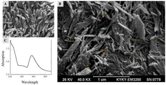 Scanning electron microscopy (SEM) and ultraviolet-visible (UV-Vis) spectrum analysis of the AuNWs. (A) and (B) scanning electron microscopy and (C) UV-Vis spectrum of the synthesized AuNWs. The length of the nanowires is around 1 µm and the diameter size is less than 50 nm.