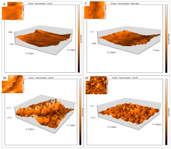 2D and 3D atomic force microscopy (AFM) images of lab-on-a-chip fibrin scaffolds with and without AuNWs: (A) S1/Au−; (B) S1/Au+; (C) S2/Au− and (D) S2/Au+. As shown in Table 1 (S1 = stiffness 1, S2 = stiffness 2). Au+ = with AuNWs, Au− is without AuNWs as indicated in Table 1. n = 6 (at least) and p = 0.05. Significant differences were observed between (A,B) samples, as well as between (C,D).