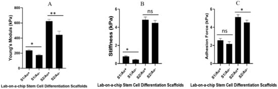 Several studies have reported the effect of Young’s modulus, stiffness, roughness, and adhesive strength of the substrate on stem cell differentiation [7,24]. The stem cells on a stiffer substrate express the osteogenic marker, while a softer scaffold promotes the chondrogenic marker in stem cells [7]. Based on our result, the microfluidic channels containing a stiffer substrate (especially with AuNWs) with high Young’s modulus, stiffness, and adhesion force promoted osteogenic differentiation. This was observed for chondrocyte differentiation in the soft substrate.